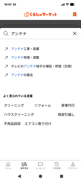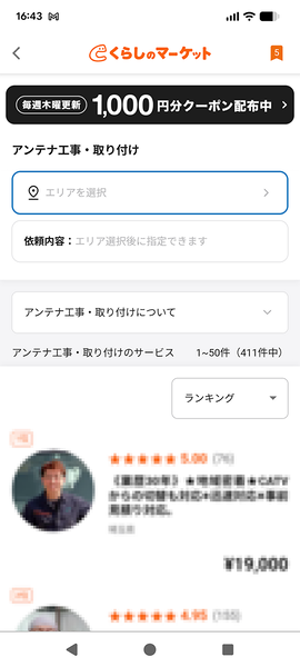 実際に、アプリ版のくらしのマーケットでアンテナ工事業者を探してみます。