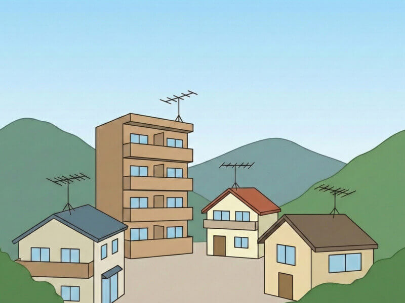 - 山や建物に邪魔されて、どの方向からも強い電波が来ていない(周囲の住宅もアンテナの向きがバラバラ)